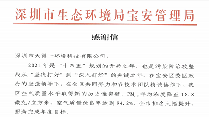 深圳市生态环境局宝安管理局给雷火竞技的感谢信