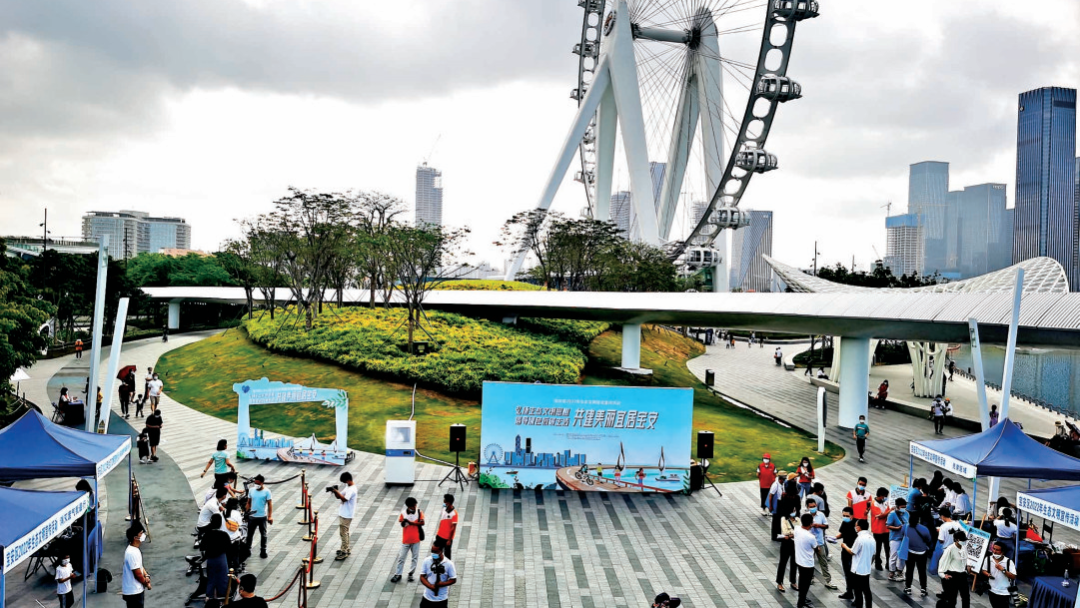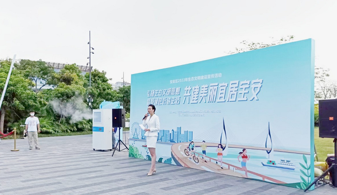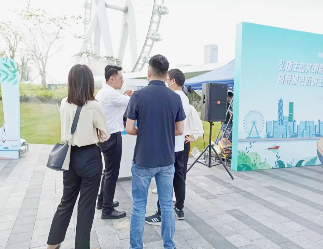 活动地点位于宝安新地标湾区之光摩天轮,正值周末往来人流众多。活动开始前,团队人员便配合主办方将设备提早运送进场,调试后安置在指定区域喷雾作业,既为当天参与活动的市民提供空气质量保障服务,同时也作为一个活“样板”向受众展示生态环保产品。