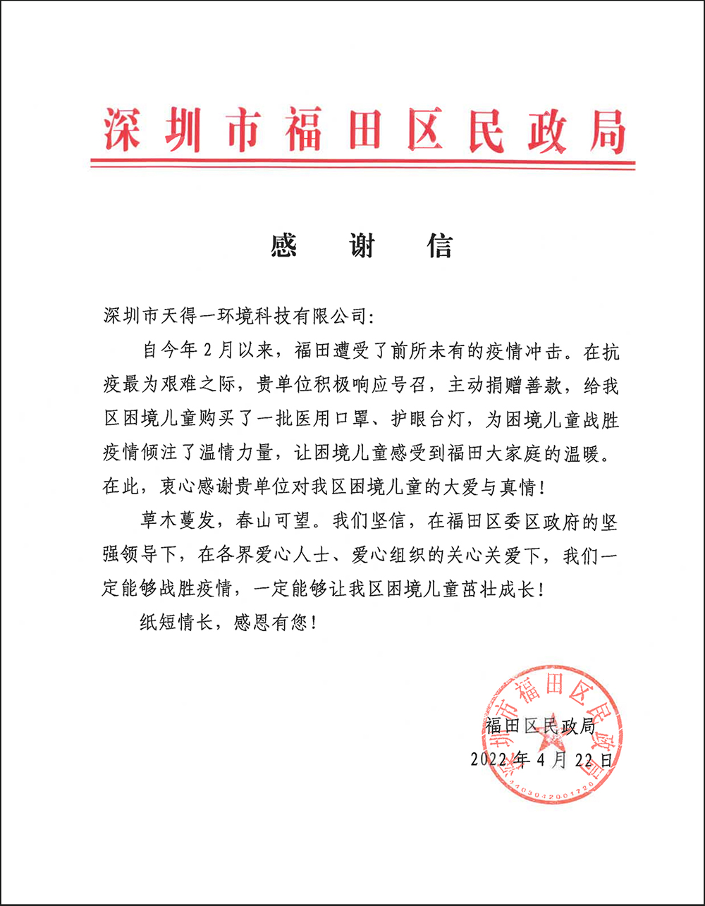 近日,雷火竞技收到了一封来自福田区民政局的感谢信,信中言辞真切,对雷火竞技在深圳抗疫期间的善举表示衷心的感谢。