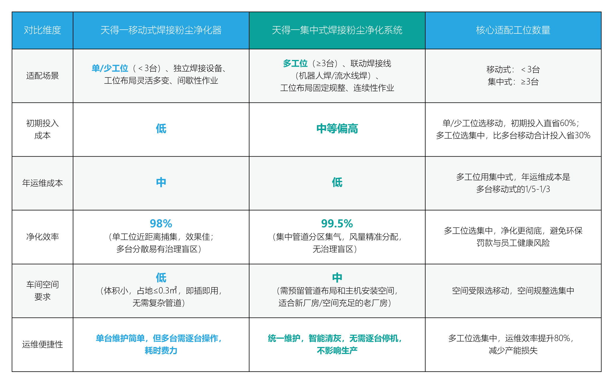 本质问题:移动式与集中式焊接粉尘治理设备本无优劣之分,脱离焊接工位数量、分布情况谈选型,就是“盲目决策”。真正的适配,是让设备贴合生产场景,既保证粉尘净化达标,又能控制初期投入与后期运维成本,实现“一次选型,全程省心”。