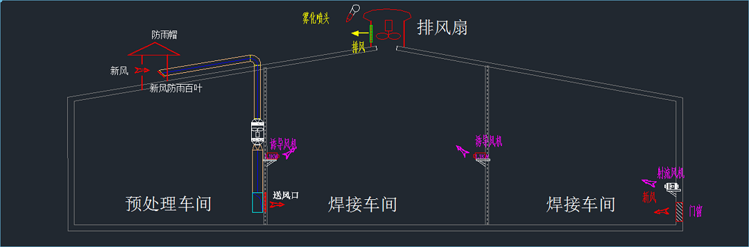 车间焊接作业高度集中,产生烟尘量大。车间原焊烟收集系统无法将焊烟完全收集,导致车间上方悬浮大量烟尘,对这部分烟尘采用整体换气的治理措施。