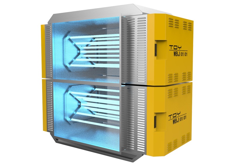 TDY-UV型智能式UV光解净化设备利用特制的高能UV紫外线光束分解空气中的氧分子产生游离氧(即活性氧),废气通过排风设备输入到UV光解净化设备后,高能UV紫外线光束及臭氧对废气进行协同光解氧化作用,使恶臭气体物质降解转化成低分子化合物、水和二氧化碳,再通过排风管道排出室外。
