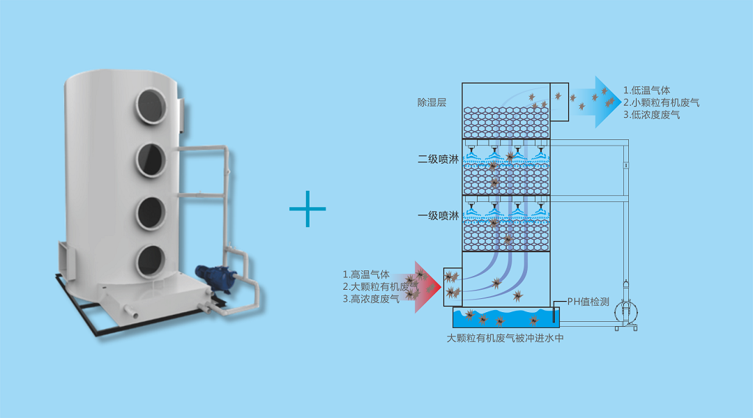 吸收技术净化原理:利用气体与液体间的接触,将有机废气与被污染的液体分离净化。采用气液逆向吸收方式处理,即液体自塔顶向下以雾状(或小液滴)喷洒而下。废气则由塔体(逆向流)达到气液接触之目的; 此处理方式可冷却废气、去除颗粒及净化气体,再经过除雾段处理后,排入下一处理环节。