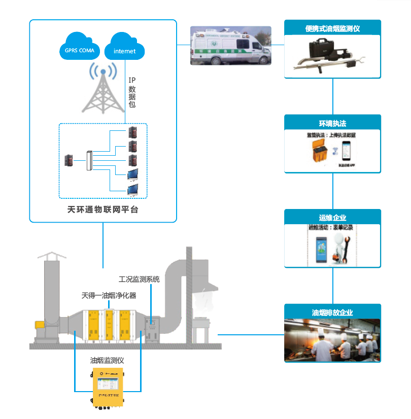 餐饮业的油烟污染是仅次于工业污染和交通污染的第三大污染源,是政府重点关注的环境污染问题,为此,天得⼀完全⾃主研发的油烟在线监测系统是⼀套⾼性能的油烟监测、数据采集、数据传输、数据统计与分析系统。该系统利⽤激光检测技术、⼊式技术、互联⽹技术、⽆线通信技术,对餐饮企业油烟的排放浓度、净化器系统运⾏状态、风机运⾏状态等指标进⾏24⼩时全⽅位在线监测,系统将油烟治理设施⼯况数据与油烟浓度排放数据统⼀起来,实现感知监测、分析、统计和运维服务的全过程管理,为环保局和企业提供真实有效的油烟排放状况。