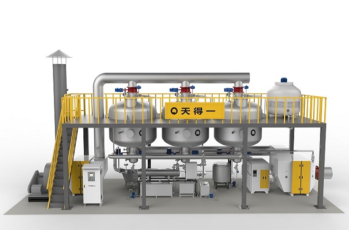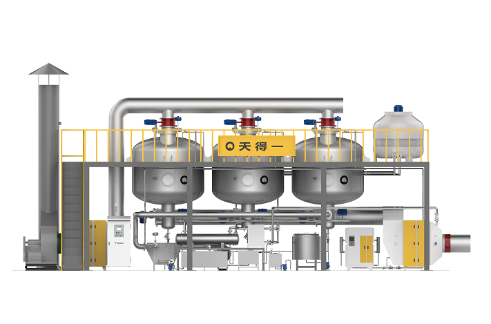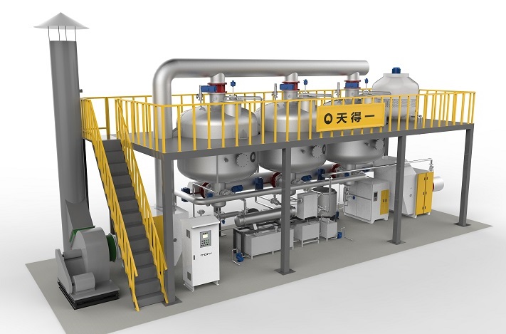 4.冷凝回收:溶剂和水蒸气一起进入管式多线程冷凝设备后,在循环冷却水的作用下实现气液冷热交换,溶剂蒸汽和水蒸气逐步变换成液相,流入后端的智能分离设备。