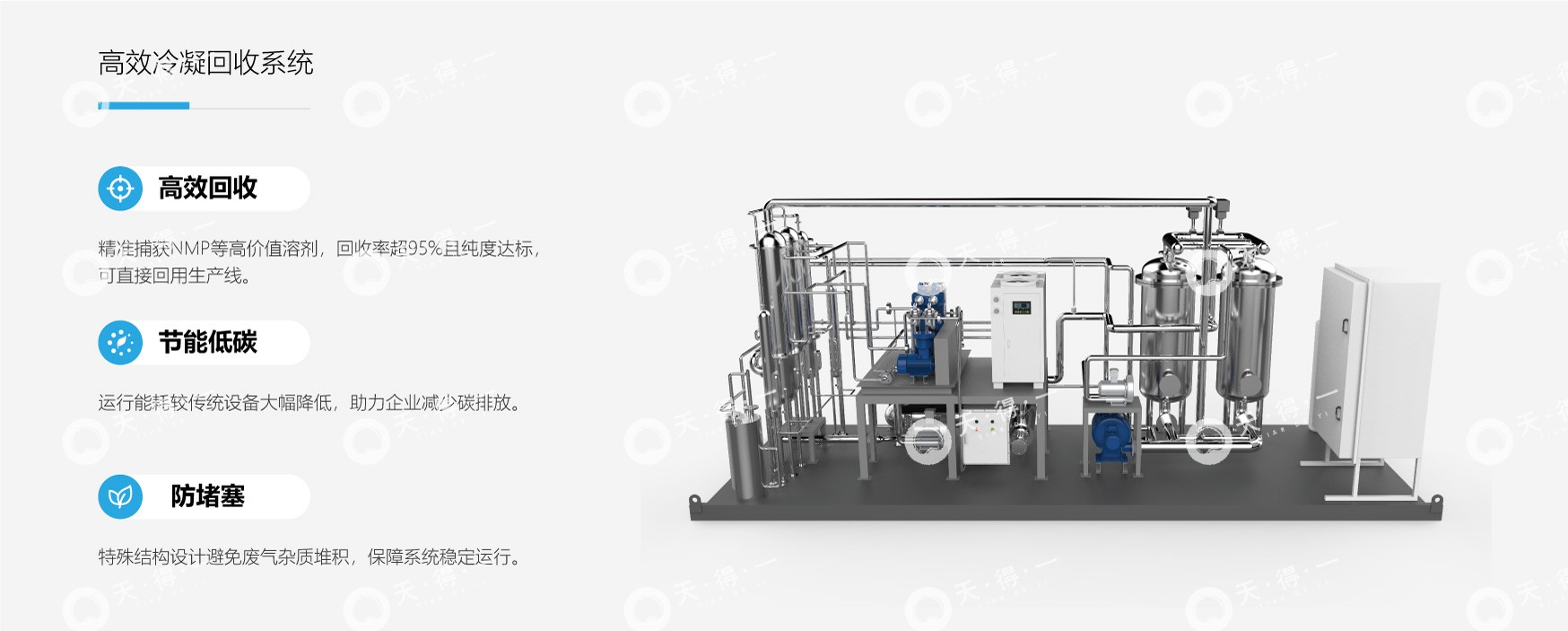 我司采用“热量回用 + 冷凝 (+吸附脱附冷凝)+ 高塔吸收/活性炭吸附”组合工艺进行高效处理与资源回收,涂布机排出的废气首先经过换热器,将热量传递给回用尾气,随后进入二级梯度冷凝系统,可实现90%以上NMP的冷凝回收。净化后的尾气中90%–95%部分经换热升温后,返回涂布烘干系统循环使用,形成闭路循环与热能回用,兼顾节能与低碳运行,对于回用气体洁净度要求更高的工况,系统可升级增设吸附脱附+冷凝单元,进一步降低回用废气中NMP浓度。