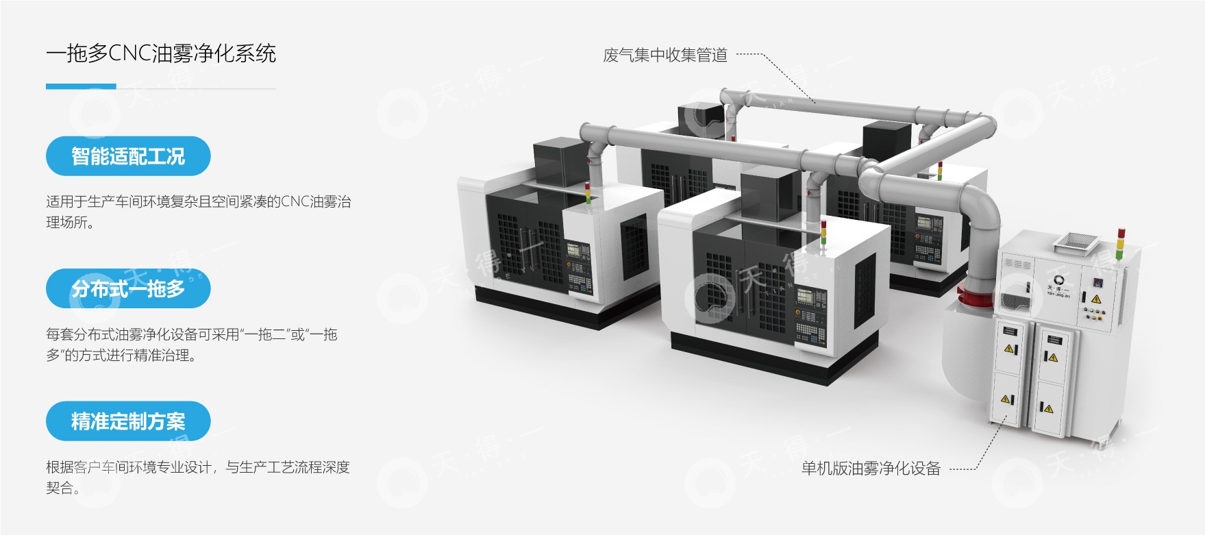 针对此类复杂废气工况,可采用我司“一拖多CNC油雾治理系统”,该系统的优势在于可根据机台摆放位置、车间高度等情况,进行精准的区域化分布式治理,每套分布式净化设备可采用 “一拖二” 或 “一拖多” 的灵活方式,对 CNC 设备产生的油雾进行精准高效治理。