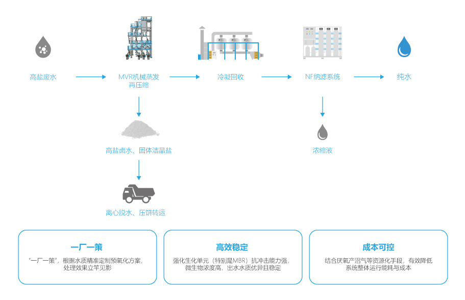 高效蒸发脱盐:采用国际领先的MVR(机械蒸汽再压缩)或多效蒸发技术,将废水中的水分蒸发出来形成高品质中水,污染物则被浓缩为高盐卤水乃至固体结晶盐,实现水与盐的彻底分离。