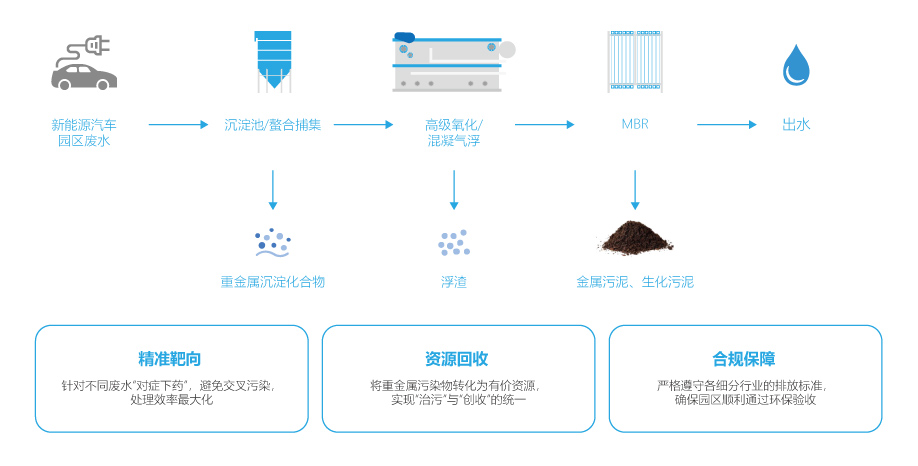 新能源汽车产业园废水主要来自电池制造(正负极材料、电解液)、整车涂装和零部件电镀等制程,废水种类繁多,包括含镍、钴、锰、锂等重金属的废水,高COD、高色度的涂装废水,以及含氟、含磷废水。这些污染物毒性强、难降解,若不分类处理,会造成严重且持久的重金属污染,我司坚持“源头分类、分质处理、末端综合”的原则,含重金属废水经化学沉淀/螯合捕集技术处理;涂装废水采用高级氧化/混凝气浮破除COD;各股预处理后的废水与生活污水混合,进入MBR生化系统深度净化。