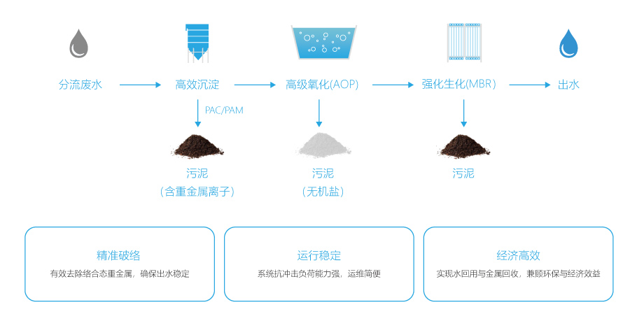 废水处理系统: 采用“高效化学沉淀 + 高级氧化 + 强化生化(MBR)”组合工艺。