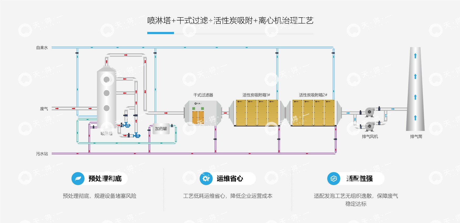 我司以兼顾预处理与深度净化,低耗高效易运维,采用“喷淋塔+干式过滤+活性炭吸附+离心机”治理工艺:通过喷淋塔拦截部分大颗粒及冷凝液滴;随后进入干式过滤,去除残留细微粉尘和黏性物质,避免堵塞后续设备;接着由活性炭吸附塔吸附 VOCs;最后经离心机确保净化后废气达标排放。