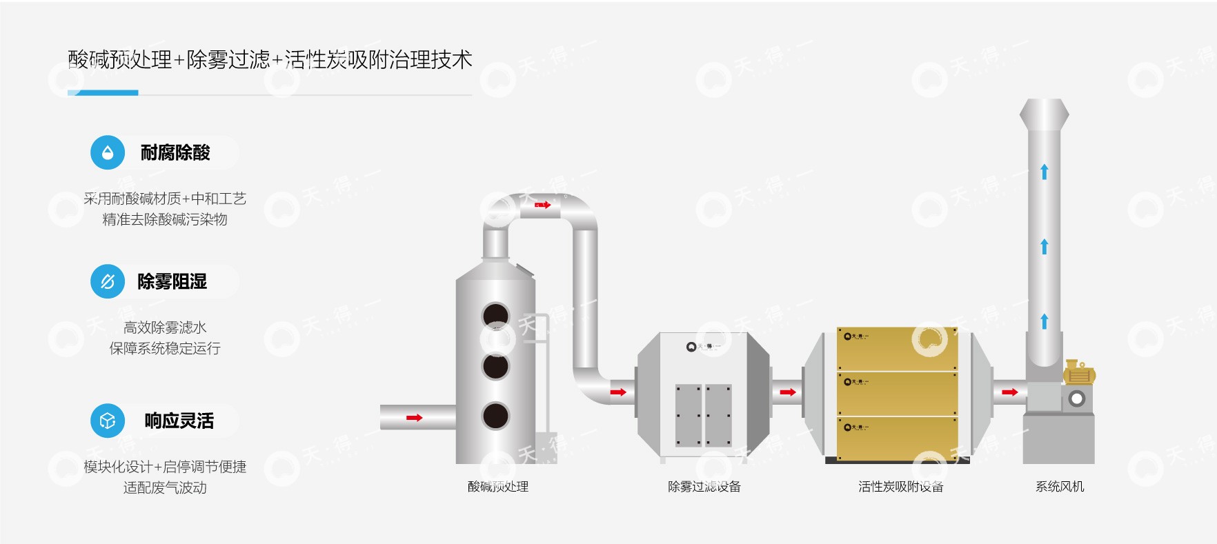针对此类复合污染废气,我司设计“酸碱预处理+除雾过滤+活性炭吸附”三级协同净化系统,实现分质高效处理。一级酸碱净化:针对腐蚀性气态污染物,提供湿式酸碱喷淋塔与干式化学吸附两种优选路径,湿式喷淋通过定制碱液/酸液循环系统,高效中和酸雾/碱雾;干式吸附则采用我司特制化学吸附剂,选择性去除HF、HCl等污染物,无废水产生,适用于水资源受限场景。二级除雾拦截:湿法工艺后配备高效除雾器,采用高精度除雾滤芯,有效阻断水汽携带,消除“白雾”现象,同时设置多级干式过滤器,进一步拦截气溶胶与颗粒物,保障后端系统运行安全。三级有机吸附:经前级处理后的废气,通过高性能活性炭床,实现对苯系物、酯酮类等VOCs的深度吸附与富集,最终确保废气持续稳定达标排放。该系统具备抗腐蚀、抗潮湿、适应浓度波动的技术特点,可有效解决实验室废气治理难点,实现环境友好与运行可靠的治理目标。